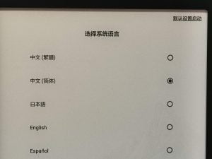 【中国版】の場合は、右上にある【默认设置(デフォルト設定スタート)】を押してください。言語設定はアップデート後に変更します。【英語版】の場合はこの画面で日本語をお選びください。