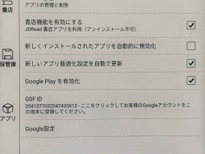 【アプリ】の画面において、【GooglePlayを有効化】のボタンをクリックしてください。その後、GSF IDのボタンをクリックすることにより、IDの登録が行えます。